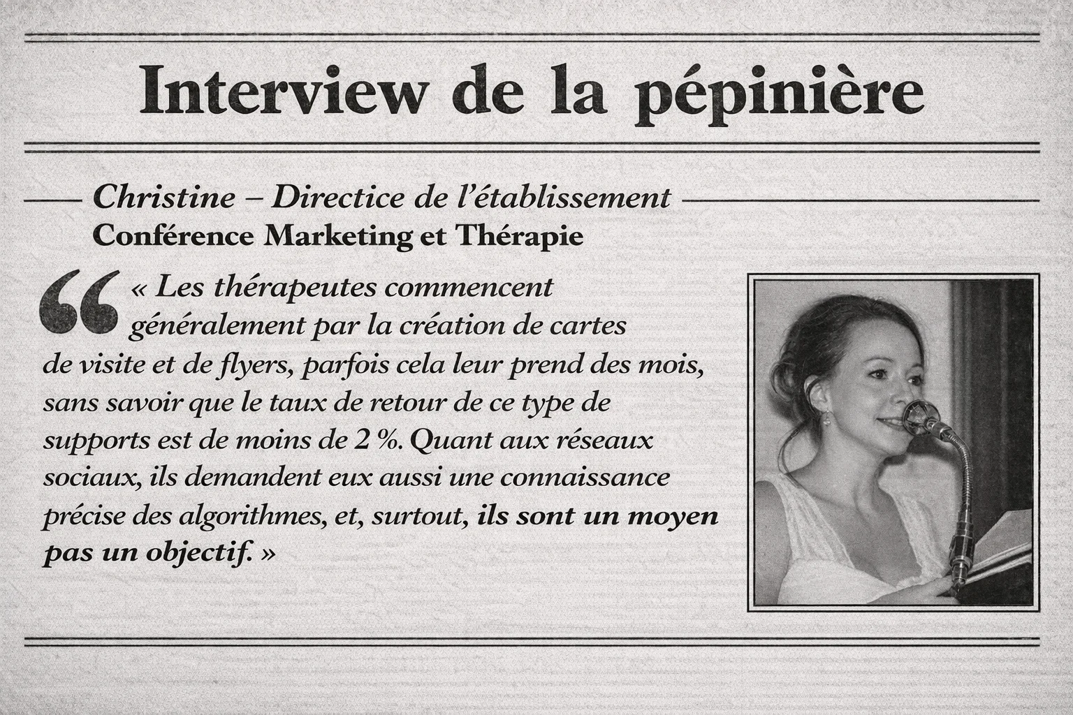 Plus qu’un service de location de bureau, notre concept est fondé sur le principe d’une pépinière de thérapeutes : aider à la création d’entreprise, apporter de la visibilité sur les réseaux sociaux, comprendre les codes du marketing, travailler en équipe, adopter une stratégie multi-canal grâce au site internet dédié ; construire une identité professionnelle.